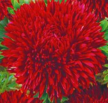 Астра игл Эсмеральда. Растение пирамидальной формы устойчивое, крепкое, высотой около 60-70 см. Соцветия рубиново-красного цвета, густомахровые, игольчатые, диаметром 10-12 см. Цветет в августе-сентябре. Используют очень широко: для посадки в сборные цветники группами, на рабатки - рядами, для бордюров и срезки.