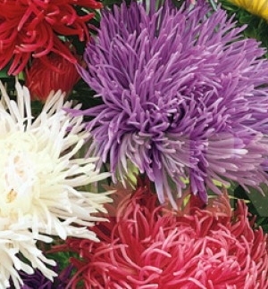 Астра коготковая Смесь окрасок. Растения пирамидальной формы, высотой 70-75 см. Цветоносы прочные, длиной 50 см. Соцветия округло-плоские, махровые, диаметром 7-10 см, разнообразной окраски. Язычковые цветки сложены по длине в трубки, слегка загнуты внутрь, закрывают диск жёлтых трубчатых цветков. Цветёт в августе-сентябре. Используют очень широко: для посадки в сборные цветники группами, на рабатки - рядами, для бордюров и срезки.