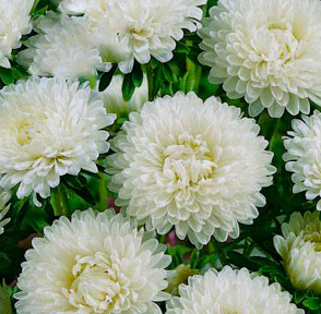 Астра низкорослая Белый ковер. Растение компактное, высотой около 20 см. Соцветия белые. Цветёт обильно с июля до морозов. Используют в сборных цветниках, на рабатках, для бордюров и мини-букетов.