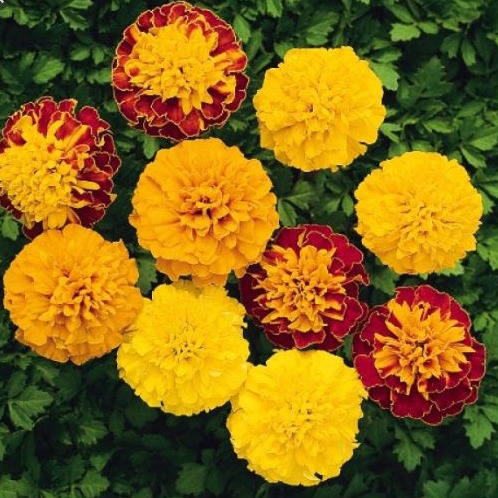 Бархатцы отклоненные махровые Бой смесь. Куст компактный, высотой 20 см, густоветвистый. Соцветия гвоздиковидные, махровые, диаметром 3,5-4,5 см. Цветёт с июня по август. Используют для клумб, рабаток, бордюров  и создания декоративных пятен.