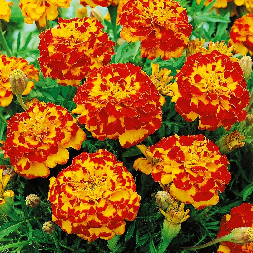 Бархатцы отклоненные махровые Болеро. Куст компактный высотой до 30 см, густооблиственный. Соцветия гвоздиковидные, коричнево-красные с золотистыми метками, диаметром до 5 см. Цветёт с июня по сентябрь. Используют для клумб, рабаток, бордюров и создания декоративных пятен.