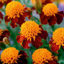 Бархатцы отклоненные махровые Золотая головка. Куст компактный, густооблиственный, высотой 20-25 см. Побеги прочные, зеленые, с красным налетом. Соцветия хризантемовидные, махровые, диаметром 3,5-4 см. В центре золотисто-желтые, крупные трубчатые цветки и манжетка из одного ряда темно-красных язычковых цветков, отогнутых к низу, со слегка волнистым краем. Используют для клумб, рабаток, бордюров и украшения балконов.