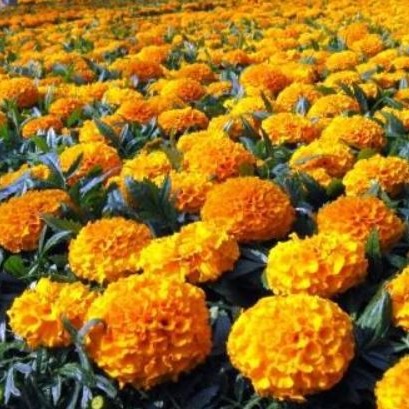 Бархатцы прямостоячие низкорослые Золотисто-оранжевые. Растения низкорослые, сильноветвистые. Соцветия густомахровые, плотные, шаровидной формы, желтой окраски. Используют для декоративного озеленения: в цветниках, бордюрах, для оформления балконов; для создания изысканных композиций в вазонах и контейнерах. Цветение раннее, обильное и очень длительное.