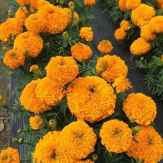 Бархатцы прямостоячие Гавайи. Куст компактный, высотой до 90 см. Побеги прочные, ребристые, светло-зеленые. Соцветия гвоздиковидные, полушаровидные, до 10 см в диаметре, оранжевые. Цветет с июля по октябрь. Используют для клумб, рабаток, высоких групп, на срезку.