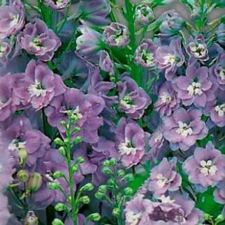 Дельфиниум культурный Джиневер. Группа Тихоокеанские гибриды (Pacific giant), высотой 150-180 см. Растение развивает по 8-10 цветочных стеблей. Цветки махровые лавандово-розовые с белым глазком. Цветет в июне-июле. После основного цветения цветоносы срезают, чтобы вызвать вторую волну цветения в августе-сентябре. Используют для групповых и одиночных посадок, срезанные цветы хорошо сохраняются в воде.