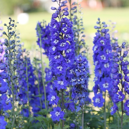 Дельфиниум Блу Бед (Delphinium Pacific Blue Bird) представляет собой весьма привлекательный, высокорослый (до 160 см), синий с белым цветок в виде монументальных свечей-соцветий.
