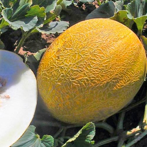 • Плод округлый, темно-желтый, без рисунка, слабосегментированный, сильноморщинистый с толстой сплошной сеткой.
