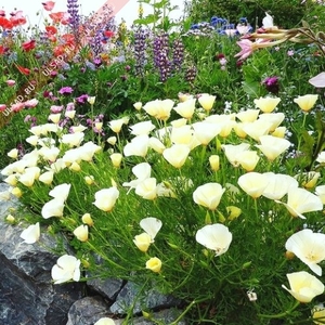 Эшшольция Белый замок. Многолетнее растение до 40 см высотой, используемое как однолетнее. Стебель прямой, тонкий, с многочисленными ребристыми серо-зелёными, голыми побегами. Цветки одиночные, чашевидной формы, 5-8 см в диаметре. Цветет обильно с июня по октябрь. Используют для клумб, рабаток, каменистых горок.