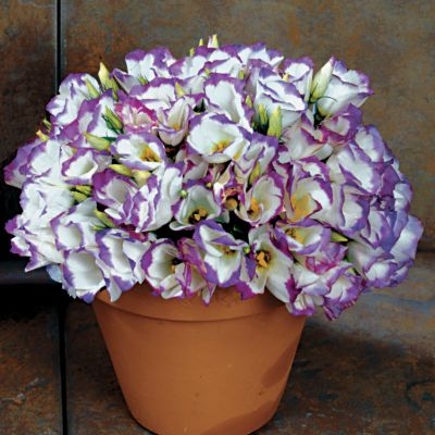 Эустома Сапфир F1. Очень привлекательное растение, высотой 10-15 см, с сизыми, словно покрытыми воском листьями. Цветы крупные воронковидные. Предпочитает солнечное место. Требуется обильный полив по мере подсыхания почвы и частое опрыскивание листьев. Зимует при температуре +10°С. Еженедельные подкормки способствуют более пышному и продолжительному цветению.Семена высевают с февраля по август в ящики с легким песчаным грунтом, слегка вдавливая их в почву. Посадочную емкость накрывают стеклом и ставят в освещенное теплое место, почву поддерживают во влажном состоянии. Оптимальная температура почвы для прорастания +20-25°С, всходы появляются через 10-15 дней. Сеянцы необходимо притенять, пикировать через месяц после всходов по 3-5 штук в горшок, диаметром 10-15 см, с питательной рыхлой почвой. Цветение через 6-7 месяцев.