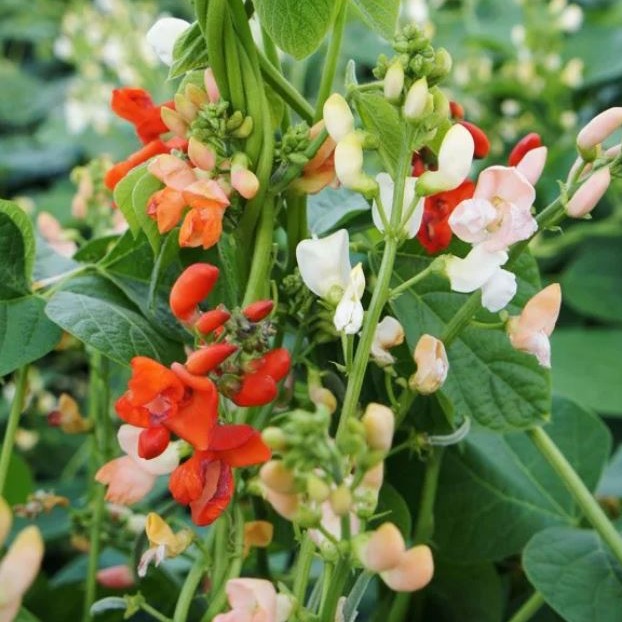 Фасоль вьющаяся Смесь окрасок. Стебли тонкие, вьющиеся, поднимаются на высоту 2,5 м. Листья многочисленные, темно-зелёные. Цветы белые, лососево-розовые, оранжево-красные. Цветёт обильно с июля до сентября. Декоративную ценность представляют и плоды растения – крупные, шероховатые бобы. Используют для вертикального озеленения и устройства пирамид на газонах.