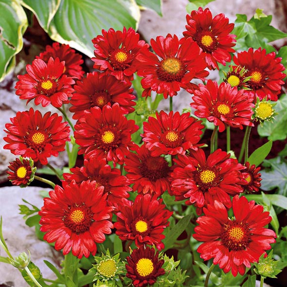 Гайлардия Бургунди. Растение высотой 60 см. Длинные, гибкие, свободно приподнятые над листьями цветоносы заканчиваются крупными вино-красными соцветиями-корзинками. Цветение обильное и продолжительное, с июня до поздней осени. Гайлардии хорошо смотрятся в композициях с другими многолетниками.