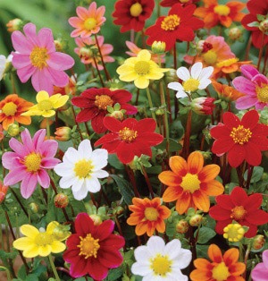 Георгина Радуга. Садовая группа с компактной формой растений высотой до 60 см. Цветки собраны в крупные немахровые соцветия-корзинки, диаметром 8-9 см, ярких оттенков: белые, розовые, жёлтые, красные, сиреневые. Обильное цветение в течение всего лета. Используют в цветниках большими группами, для бордюров и рабаток.