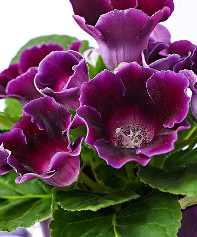Глоксиния Импресс. При благоприятных условиях одновременно появляются до 20 бутонов на одном растении. Хорошо растет в достаточно освещенных местах, но без прямых солнечных лучей. Полив постоянный, обильный; избегая попадания воды на листья и цветки, лучше применять полив в поддон. Почвенная смесь: листовая, торфяная земля, сфагнум, песок в отношении 1:1:1:1. После цветения у растения наступает период покоя.