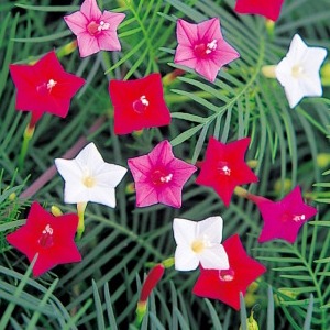 Ипомея Квамоклит. Стебли достигают 2 м длины. Листья очень красивые резные. Цветы многочисленные звездчатые, диаметром 2-3 см венчики карминово-красные, белые, розовые. Цветет обильно. Используется для вертикального оформления цветников различного назначения. Очень эффектное и необычное вьющееся растение с изящными цветками и ажурными листьями. Не требует особого ухода.