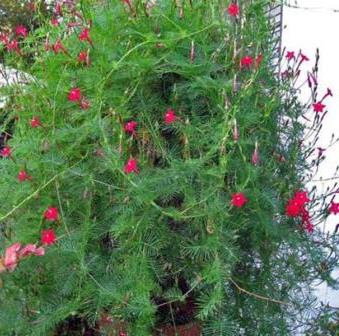 Ипомея Летняя радость. Стебли достигают 2 м длины. Листья очень красивые резные. Цветы многочисленные звездчатые, диаметром 2-3 см венчики карминово-красные, белые, розовые. Цветет обильно. Используется для вертикального оформления цветников различного назначения.