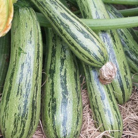 • Плод цилиндрический со сбегом к плодоножке, длиной 21-28 см, с гладкой поверхностью, бледно-зеленый с прерывистыми темно-зелеными полосами.