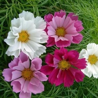 Космея Ракушка. Декоративное растение с ажурными сильнорассечёнными листьями, высотой до 90 см. Цветки собраны в соцветия-корзинки диаметром 7-10 см и расположены одиночно на концах стеблей. Язычковые цветки белые, розовые, карминные. Трубчатые в центре соцветия - желтые. Применяют для посадки на заднем плане цветников, декорирования оград и для срезки.