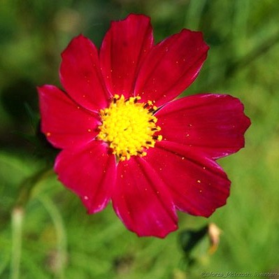 Космея Сенсация Красная. Растение высотой до 120 см. Цветки собраны в соцветия-корзинки, диаметром 7-10 см и расположены одиночно на концах стеблей. Язычковые цветки красные. Трубчатые в центре соцветия - желтые. Применяют для посадки на заднем плане цветников, декорирования оград и для срезки.
