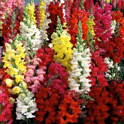 Львиный зев Смесь окрасок. Побеги прочные, прямые. Листья ланцетные, зеленые. Цветки крупные, разнообразной окраски, ароматные. Цветет с июня по октябрь. Продолжительность цветения одного цветка до 12 дней, всего растения — до трех месяцев. Используют для клумб, рабаток, групповых и массовых посадок, миксбордеров, опушек к кустарникам, для срезки. В срезанном виде стоят в воде 7-14 дней, при этом распускаются все бутоны.