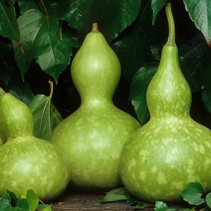 Лагенария Птичий домик. Уникальный сорт с изогнутыми плодами. Представляет собой лиану с крупными округлыми, бархатистыми листьями. Вызревшие плоды с затвердевшей корой неограниченно долго хранятся при комнатной температуре, используются для поделок. Используют для вертикального озеленения.