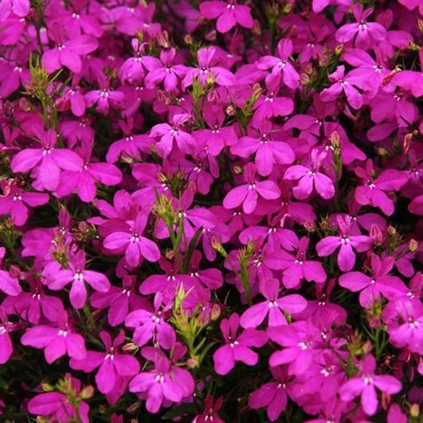 Лобелия эринус Королевский дворец. Красивое травянистое растение, сплошь усыпанное малиновыми цветками диаметром 1,4 см. Кустик компактный, густоветвистый, высотой 10 см. Листья мелкие, темно-зеленые с бронзовым оттенком. Цветет с июня по сентябрь.