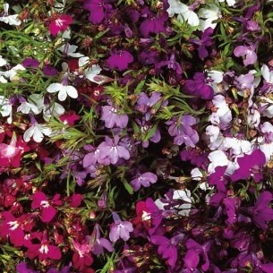 Лобелия эринус Жемчужная нить. Листья ланцетные, зеленые. Цветы небольшие разнообразных сочных окрасок. Цветет очень обильно с июня по сентябрь. Используют для подвесных корзин, балконных ящиков, как почвопокровное растение.