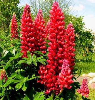 Люпин Фламинго. Растение высотой до 100 см. Листья красивые, пальчато-сложные, на длинных черешках. Карминно-красные цветки собраны в кистевидные соцветия 35-40 см длиной. Цветет в июне. Используют для бордюров, рабаток, миксбордеров.