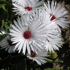Мезембриантемум Белый. Стелющееся растение с толстыми мясистыми желто-белыми листьями и стеблями. Отличается сильным ростом, образует ползучие побеги. Крупные белые цветки, диаметром 4-5 см, в пасмурные дни закрываются, но при солнечной погоде вспыхивают ярким ковром. Цветет всё лето, с июня до октября. Используют для рокариев, бордюров, каменистых горок и как горшечную культуру.