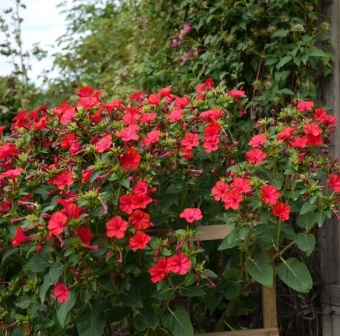 Мирабилис Красный леденец. Ароматные цветки красной окраски диаметром 5-6 см, раскрываются после 15 часов, а закрываются утром. Многолетнее растение, используется как однолетнее. Кустики 50-80 см высотой. Стебли прямостоячие, ветвистые. Цветёт обильно с июня до заморозков. Используют для оформления цветников, рабаток.