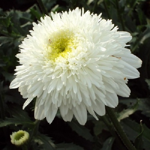 Нивяник махровый. Высота растения до 90 см. Диаметр цветка 10 см. Язычковые цветки белые, трубчатые - желтые. Хорошо смотрится в посадках на фоне декоративных кустарников, в рабатках и миксбордерах. Цветы долго стоят в срезке.