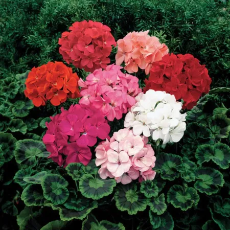 Пеларгония зональная Колорама. Превосходное сочетание компактной формы растения и крупных цветов! Растения высотой около 35 см. Листья округлые, с темным пятном в форме подковы. Цветы диаметром до 2,5 см разнообразных ярких окрасок. Прекрасно подходит для горшечной культуры, летом можно высаживать в открытый грунт и балконные ящики.
