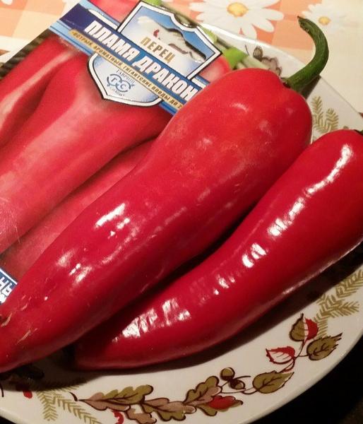 Перец Пламя дракона. Раннеспелый (100-110 дней от всходов до плодоношения) сорт с гигантскими острыми плодами для пленочных теплиц и открытого грунта. Куст раскидистый, высотой 50-60 см. Плоды очень крупные, длиной 17-20 см, диаметром 5-6 см и массой 120 г, конусовидной формы, с заостренной верхушкой, гладкие, с ароматной острой мякотью. Окраска плодов в технической спелости светло-зеленая, в биологической — красная. Толщина стенки плода 4-5 мм. Измельченные плоды используют в качестве приправы, которая усиливает вкус и добавляет пикантности приготовленным блюдам.