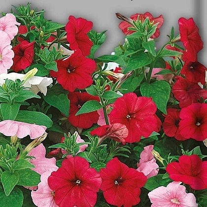 Петуния гибридная Смесь окрасок. Мощный густоветвистый куст высотой 40 см. Эффектные воронковидные цветы разнообразной окраски, края лепестков гладкие, волнистые, бахромчатые. Цветет обильно с июня по октябрь. Используют в клумбах для ярких групп, на бордюрах, рабатках, в подвесных корзинках.