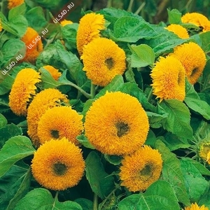 Подсолнечник однолетний Медвежонок. Стебель высотой 50-60 см, листья крупные, с заостренной верхушкой, по краю пильчатые. Многочисленные махровые соцветия, диаметром до 10 см, имеют золотисто-желтую окраску. Цветет с середины июля по сентябрь. Используют в декоративных и маскировочных группах, для срезки.