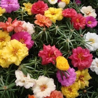 Портулак Смесь окрасок. Растение со стелющимися сочными светло-зелеными стеблями высотой до 10 см. Цветки простые или махровые, полностью открыты только в ясную солнечную погоду. Цветет с июня до заморозков. Используют в цветниках, для балконных ящиков, ковровых клумб и каменистых горок.