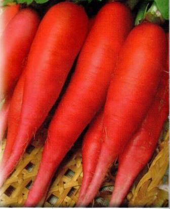 • Корнеплод розово-красный, коническо-цилиндрической формы, длиной 12-15 см, в диаметре 2,5-4 см. Корнеплод слегка приподнят над поверхностью почвы.