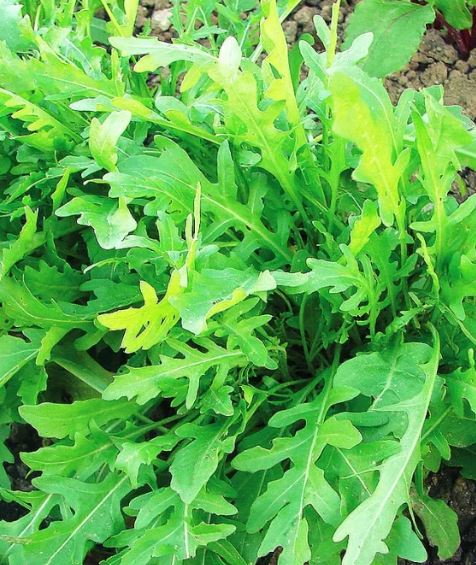 Рукола Рокет. Скороспелый сорт, от всходов до уборки зелени 20-25 дней. Листья слегка рассечены, богаты комплексом витаминов, особенно витамином С. Цениться за превосходный орехово-горчичный вкус и ароматность. Используются при приготовлении разнообразных салатов, бутербродов, мясных и рыбных блюд.Неприхотливая салатная культура, отличающаяся быстрым ростом. Свежую и полезную зелень получают через 20-25 дней после появления первых всходов. Розетка листьев полуприподнятая, диаметром 15-18 см, высотой - 18-20 см. Средняя масса розетки 20 гр. Лист зеленый, с гладкой поверхностью, сильнорассеченный. Молодые листья употребляют в свежем виде, добавляют в различные блюда. Пикантный орехово-горчичный вкус зелени сочетается с другими травами, рыбой, мясом и морепродуктами. Вкус острее, чем у руколы культурной (индау). Листья содержат много витаминов и микроэлементов. Сорт длительное время сохраняет высокие товарные качества и не переходит к стрелкованию. Посев в грунт с мая по август, на глубину 1-1,5 см. Для получения молодой зелени посевы повторяют каждые две недели. При загущенных всходах растения прореживают, а выбранные растения рассаживают на расстоянии 8-10 см. Выращивают при регулярном и обильном поливе, листья становятся крупнее, нежнее и меньше горчат. Убирают растения по мере формирования розетки.