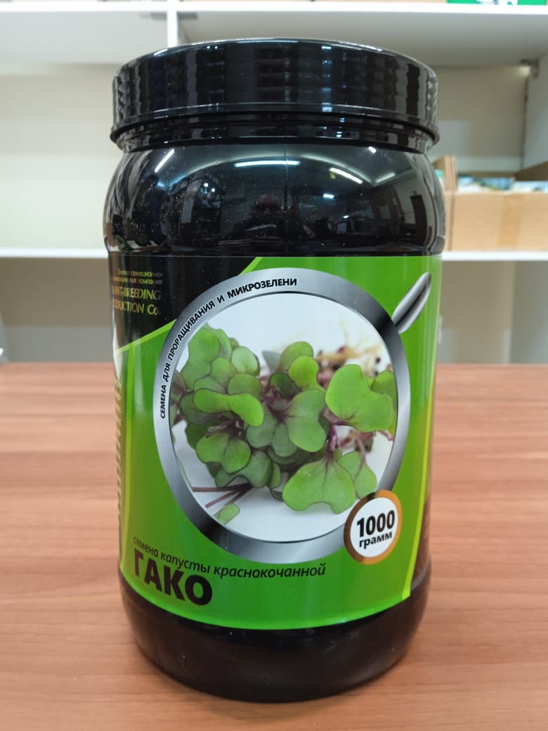 Капуста краснокочанная Гако.  Микрозелень капусты – растения с темно-зелеными с красным оттенком семядольными листочками. Нежные и сочные ростки, обладающие приятным привкусом и полезными свойствами капусты. Повышенное содержание биологически активных веществ и витаминов. Используется как самостоятельное блюдо, как гарнир, смешивается с различными овощами.