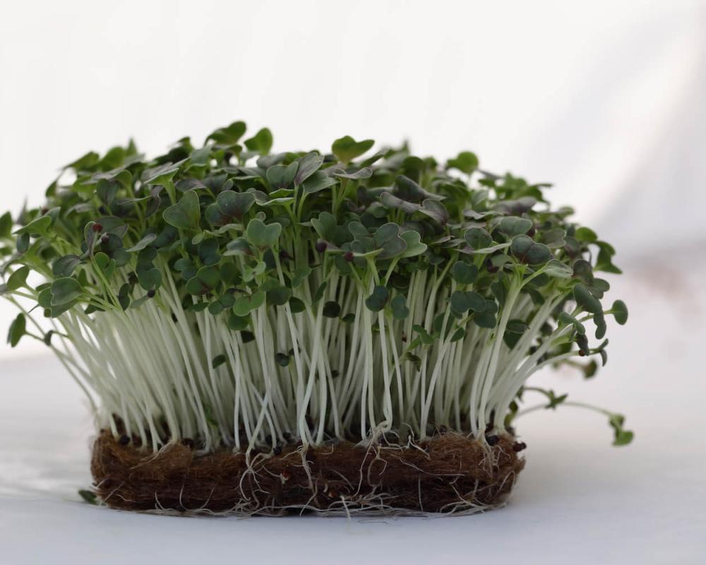 Микрозелень капусты японской Мизуна (Мицуна) Сангрия – растения с семядольными и 1-2 (до 3) настоящими листочками темно-красного цвета. Вкус мягкий, горчичный. Высокое содержание биологически активных веществ. Как полезное дополнение к различным блюдам из мяса, рыбы, салатам, сэндвичам. Благодаря ажурным, окрашенным листьям, особенно популярна в ресторанном бизнесе для декорирования готовых блюд.