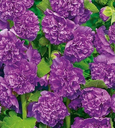 Шток-роза Виолет. Стебель мощный, ветвистый, высотой до 2 м. Крупные бархатистые махровые цветки сине-фиолетовой окраски собраны в длинные кистевидные соцветия. Цветет в июле-сентябре. Используются для небольших групп на газоне, миксбордеров, декорирования стен, заборов и на срезку. Срезанные стебли в стадии бутонов распускаются в воде.