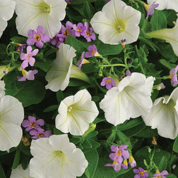 Смесь Fuseables Cloud N Sky: Бакопа Blutopia + Петуния Shock Wave Coconut. Однолетние гибридные растения. Главная особенность Фузейблс Клауд энд Скай - смешение двух видов ампельных растений: петунии (Шок Вейв) и бакопы (Блутопия).