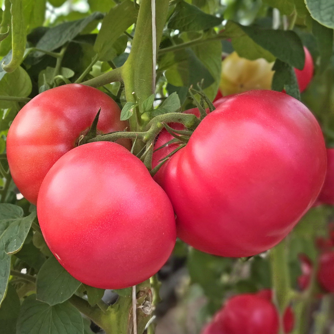 Томат Азамат F1 – среднеспелый индетерминантный гибрид томата (100-115дней от всходов до начала созревания). Рекомендуется для выращивания в первом и втором обороте пленочных теплиц, а также втором обороте остекленных теплиц. Растения мощные, вегетативного типа. Корневая система хорошо развивается на всех типах грунтов и субстратов. Растение сбалансированное, хорошо облиственное. Лист от среднего до крупного, темно-зеленый, полу-горизонтальный. Первое соцветие закладывается над 10-11 листом, последующие через 3 листа. Соцветие простое с 6-8-ю плодами. Плоды округлые, слегка приплюснутые (индекс формы плода 0,85-0,95), слабо ребристые у плодоножки, довольно плотные, с хорошими транспортабельными качествами. В стадии технической спелости зеленые с едва заметным пятном у основания, в стадии биологической спелости интенсивно-розовые. Средняя масса плода 220-240 г. Для получения крупных плодов (до 400 г) рекомендуется проводить нормирование первой кисти на 3 плода, 2-3 кисти на 4 плода, выше на 5-6 плодов. Гибрид высокоустойчив к вирусу мозаики томата, вертицилезу, фузариозному увяданию и кладоспориозу, среднеустойчив к бактериальной. Рекомендуемая густота посадки: 20-25 тыс/га.