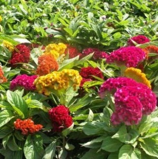 Целозия гребенчатая Коралловый сад. Растение с толстым прямостоячим стеблем, 35-50 см высотой. Соцветия в виде плотного гребня кремовой, желтой, розовой, красной и пурпурной окраски. Цветёт с начала июля до первых заморозков.