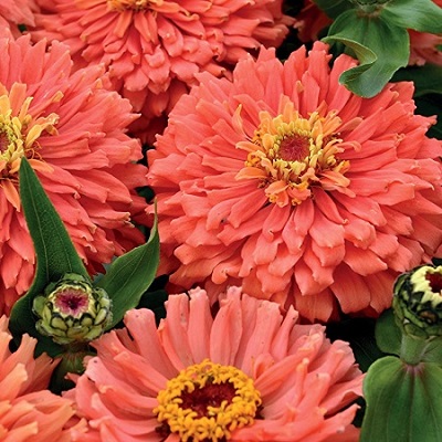 Цинния изящная Сеньора. Очень большие махровые цветы редкой окраски. Растение высотой около 90 см. Соцветия лососево-розовой окраски. Цветёт с июля по сентябрь. Широко используют для цветников и на срезку.