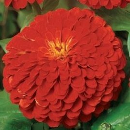 Цинния георгиноцветковая Алое пламя. Пышное и нарядное цветение. Растение мощное, ветвистое от основания, высотой 80-90 см. Плотные полушаровидные соцветия, диаметром 8-10 см, красные. Цветет с июля по сентябрь. Используют для оформления цветников, рабаток и срезки.