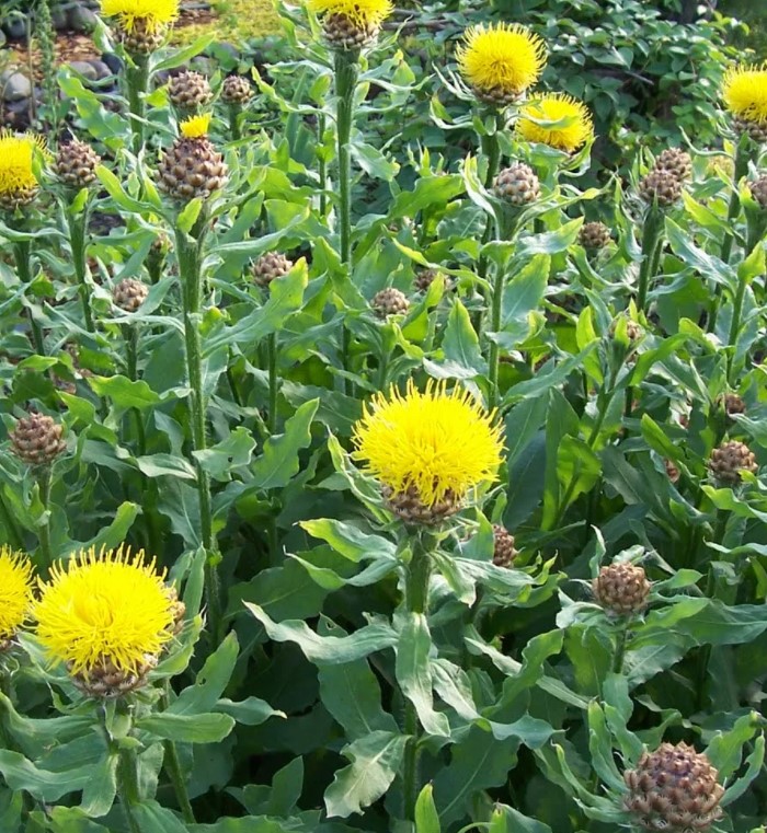 Василек крупноголовый Желтый (Centaurea macrocephala). Куст высотой до 100 см хорошо держит форму, не разваливается. На прямых толстых стеблях распускаются жёлтые «шары», диаметром до 5 см. Листья продолговато-ланцетные. Цветет в июле-августе.. Используют для групповых посадок, миксбордеров, рокариев, а также служат хорошим украшением для букетов.