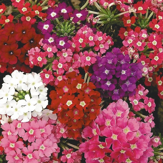 Вербена гибридная Идеал. Популярное растение, с красивыми, слегка душистыми (вечером) соцветиями. Растение высотой 30 см. Миниатюрные цветки собраны в шаровидные соцветия до 5 см в диаметре, самых разнообразных ярких окрасок: розовые, вишневые, красные, нежно-голубые, лиловые, белые.  Цветёт с июня по октябрь. Используют для клумб, рабаток.